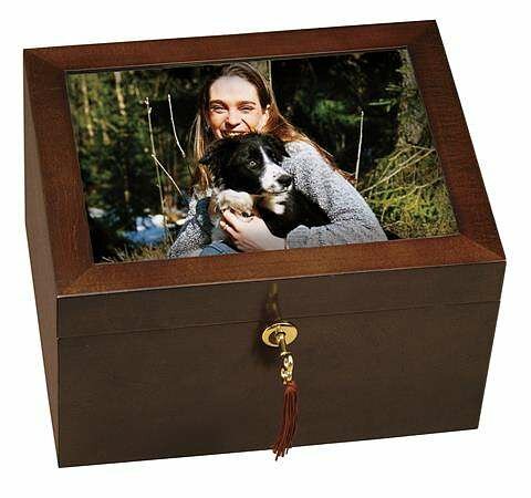 • This memorial chest features a Windsor Cherry finish on solid hardwoods with a photo frame lid and a crushed velvet
