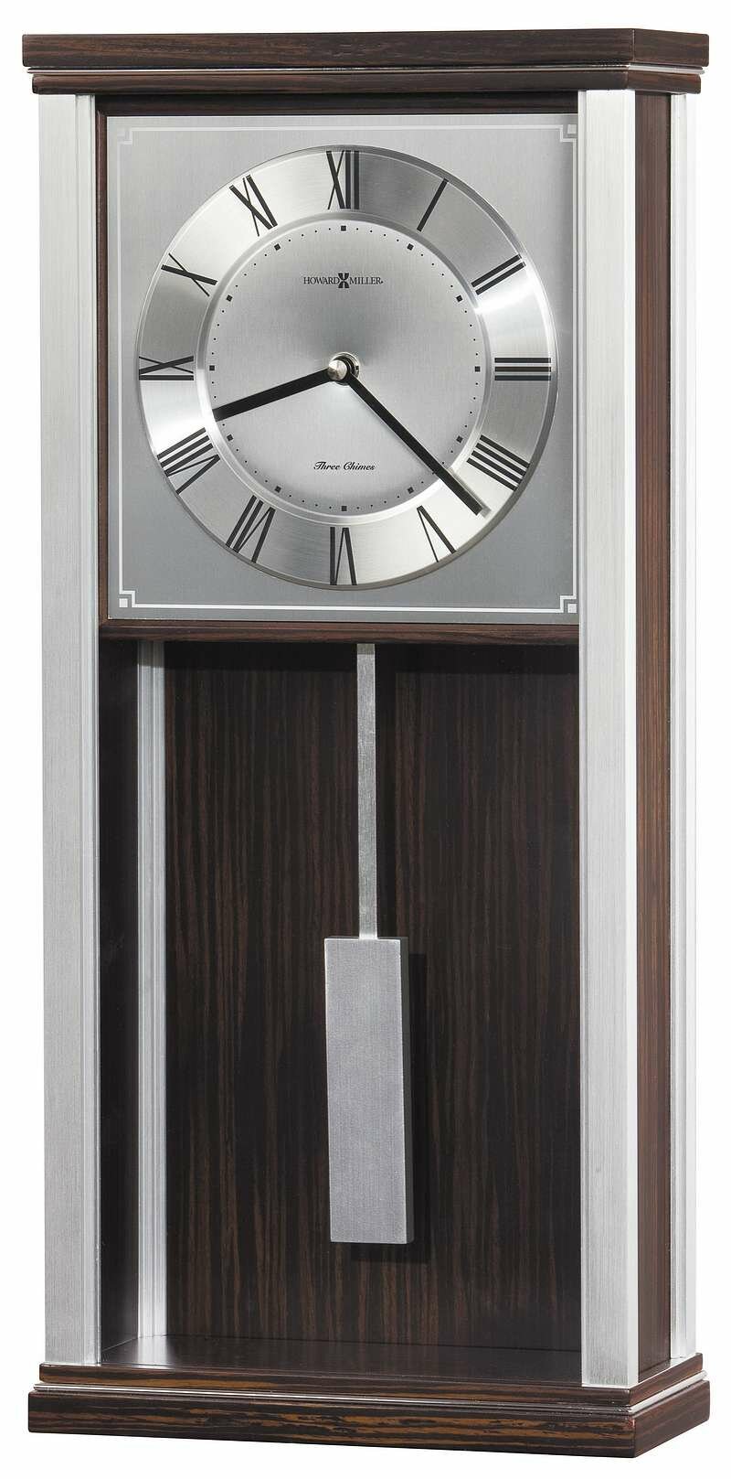 • This wall clock features brushed aluminum corners and polished silver-tone accents which complement the ebony finished top and base.