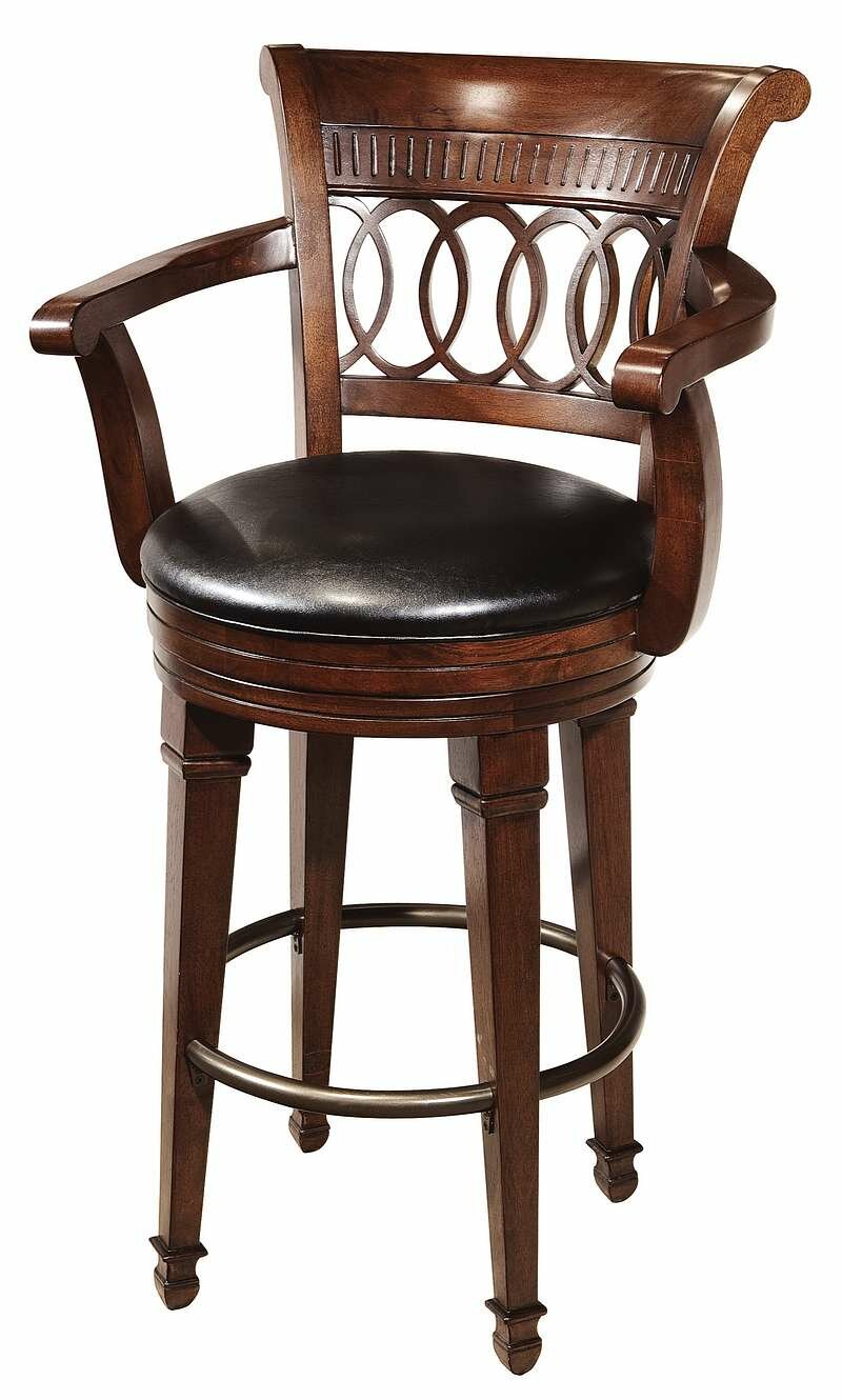 • Tuscany Cherry finish on select hardwoods and veneers with light distressing. Black faux leather seat cushion with an antique brass-tone metal footrest.