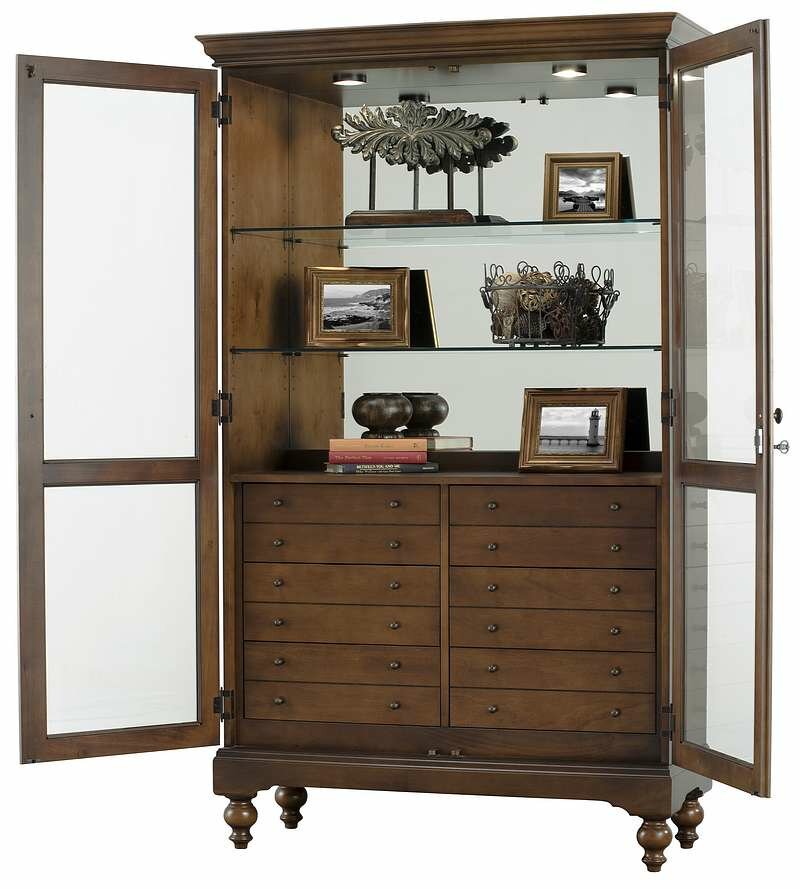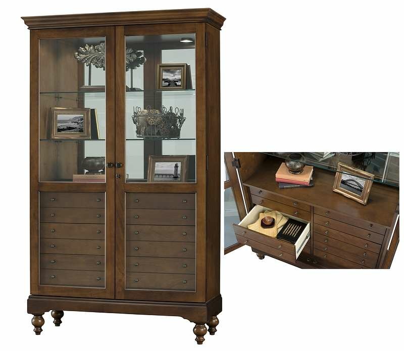 • Six interior drawers with oil rubbed bronze knobs are located behind the glass doors, providing additional storage.