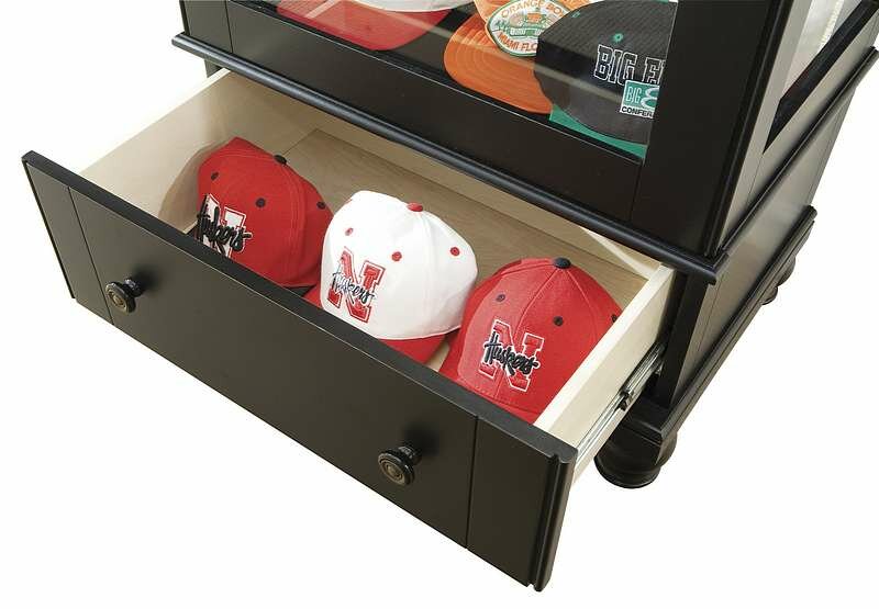 • This cabinet features a lower drawer for additional storage and turned spooled legs.