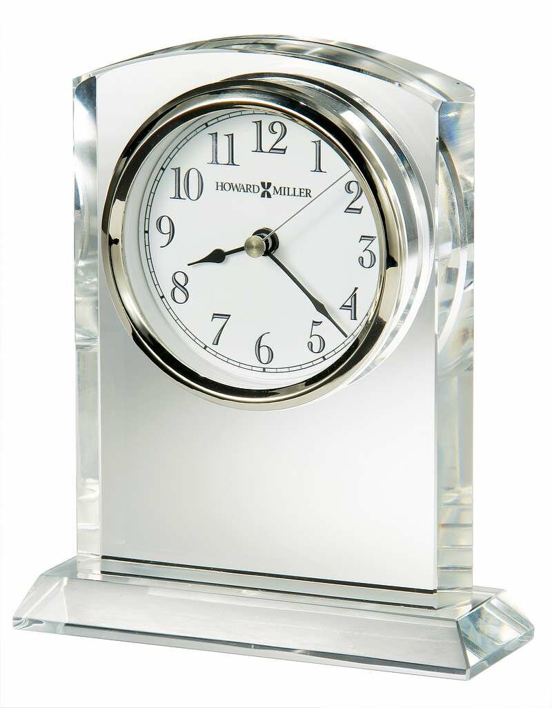 • This gently arched, optical crystal table clock with beveled sides and base features a white dial with two-tone Arabic numerals and Black minute track, surrounded by a polished silver-tone bezel.