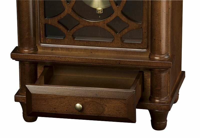 • Finished in Tuscany Cherry on select hardwoods and veneers, this flat-top wooden mantel clock features a unique fret cut grill over plain glass, turned columns, and decorative top molding.