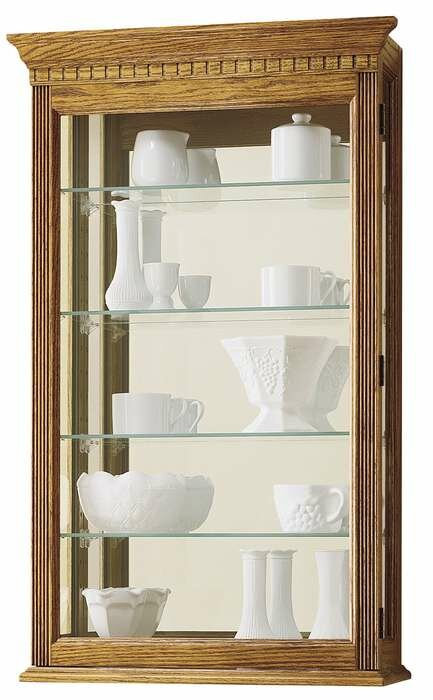 The Montreal Wall Curio Cabinet by Howard Miller is finished in Golden Oak on select hardwoods and veneers and features acanthus leaf molding on the pediment and reeded columns.