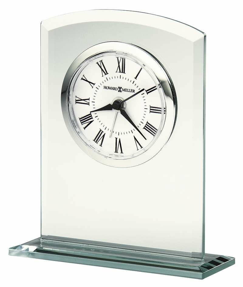 • The dial is suspended within The curved, beveled Glass of This tabletop clock, which sits on a beveled Glass base.