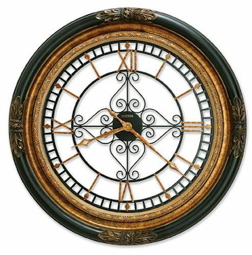 • The wrought-iron dial with center scroll décor offers applied Roman numerals, markers, and open fret-cut, diamond shaped hands finished in aged gold.