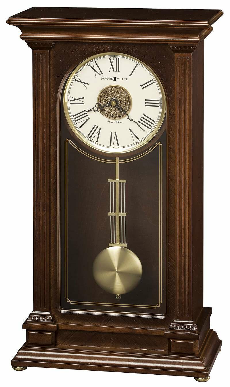 • Finished in Cherry Bordeaux on select hardwoods and veneers, this wooden mantel clock features an inverted V-matched teak wood veneer on the front of the case, fluted columns, and gold detail on the flat glass front.