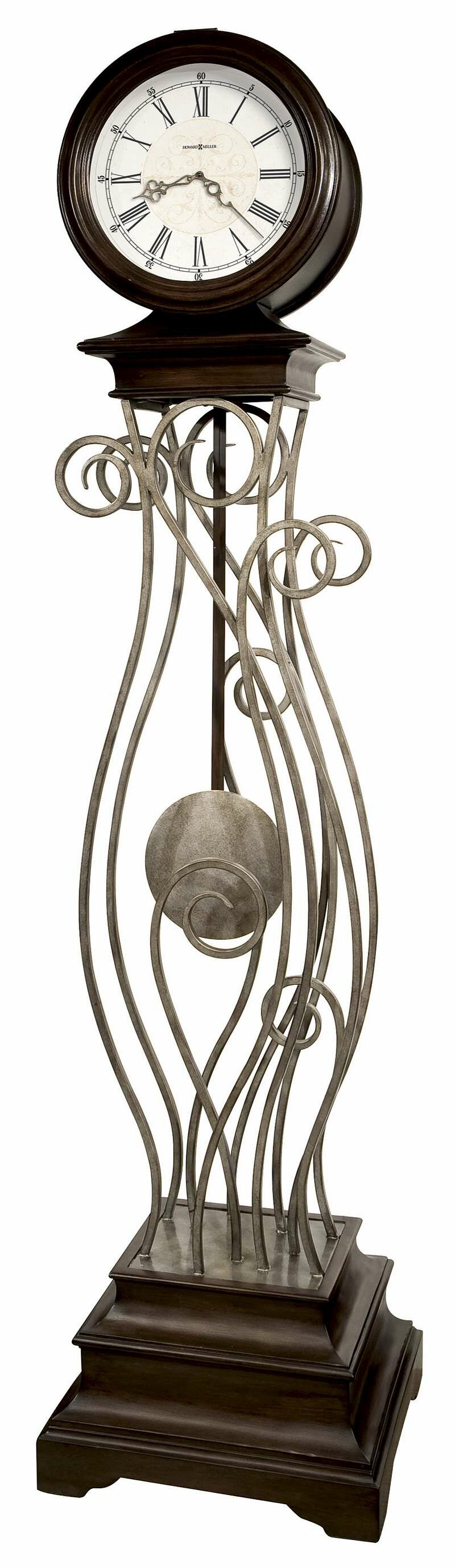 • This elaborate metal framework floor clock features an Antique Nickel finish with an Earth Brown finished top and base.