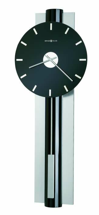 The Hudson Wall Clock by Howard Miller is a contemporary wall clock that features a half round center finished in high-gloss black lacquer with contrasting brushed nickel-finished side panels.