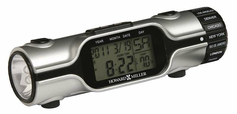 • This clever world time travel alarm clock doubles as a LED flashlight, and is finished in metallic silver with black trim.