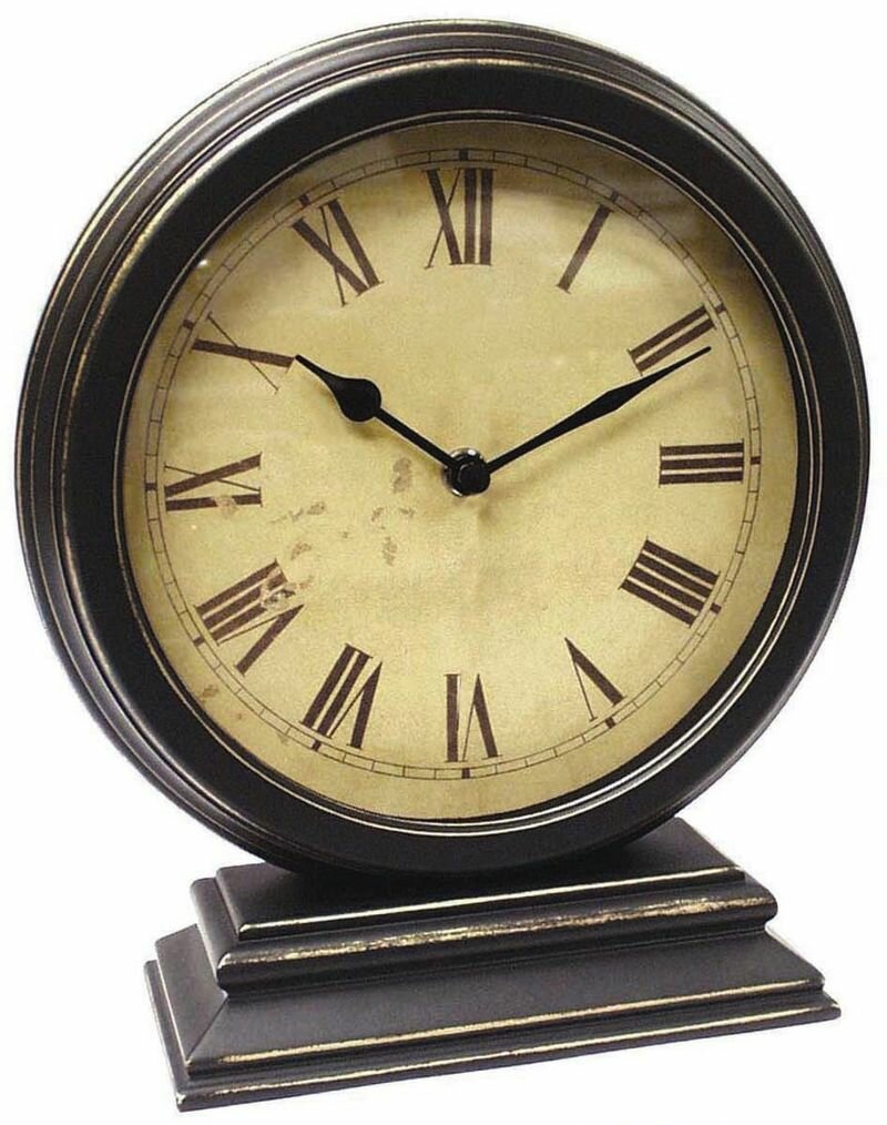 Traditional style round table clock. Distressed case and stand with an antiqued dial, Roman numerals at every hour and black metal hands.