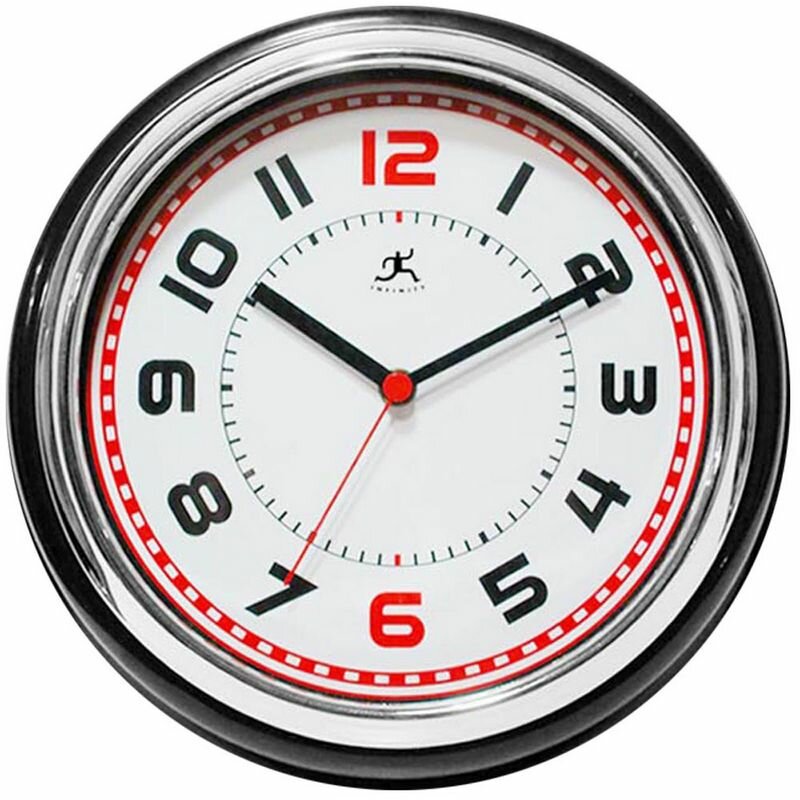 50's Retro style black resin wall clock with silver bezel and deep case. Dial features a red second hand behind flat glass lens. Never miss the top and botton of the hour with the red 12 and 6.