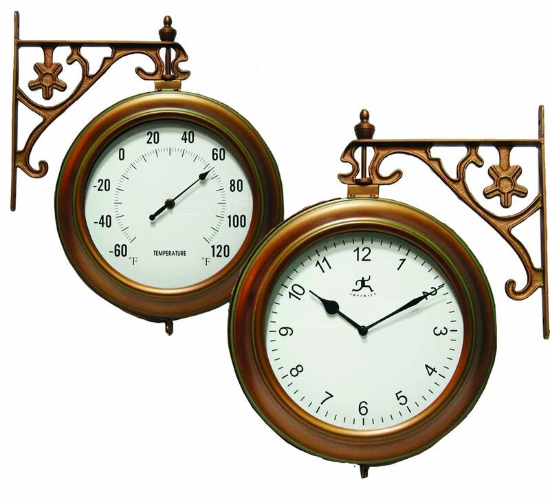 Faux aged copper indoor or outdoor two-sided clock/thermometer. Black metal hands and Arabic numbers at all hours. Includes a metal bracket for hanging. Waterproofed for protection against most climates.