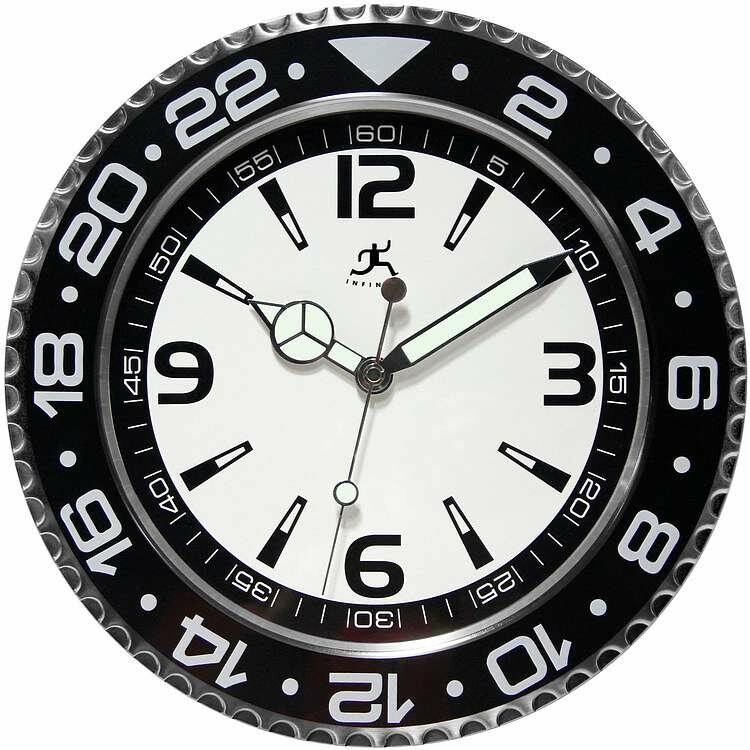 Bazel watch style designed steel wall clock is a classic sports watch designed clock that will look great in most homes. With large 12, 3, 6, and 9 Arabic Numerals and luminous hands make this classic style clock easy to read. 13.5" Round Diameter. Steel Case w/ luminous hands.