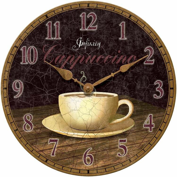 Dreamy Cappuccino is the ideal wall clock for the coffee lovers out there. The Dreamy Cappuccino has an artistic coffee house look and feel to this very popular clock. 13.5" Round Diameter. Open Face, Antique Gold Metal Hands.