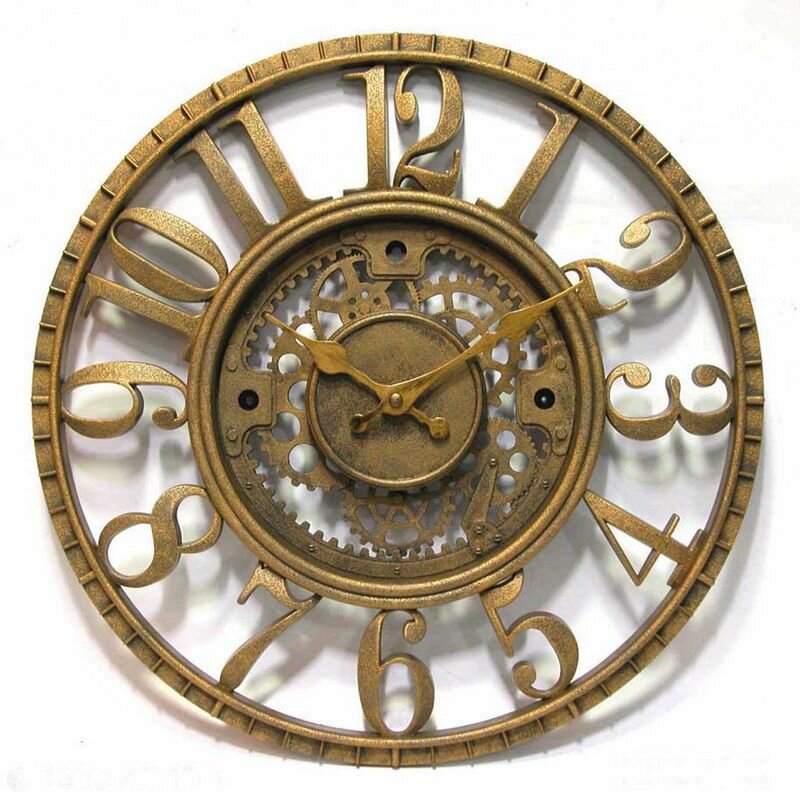 Antique gold resin wall clock. Open dial clock featuring gear movements. Large easy to ready Arabic numbers at every hour. Gold resin hands.