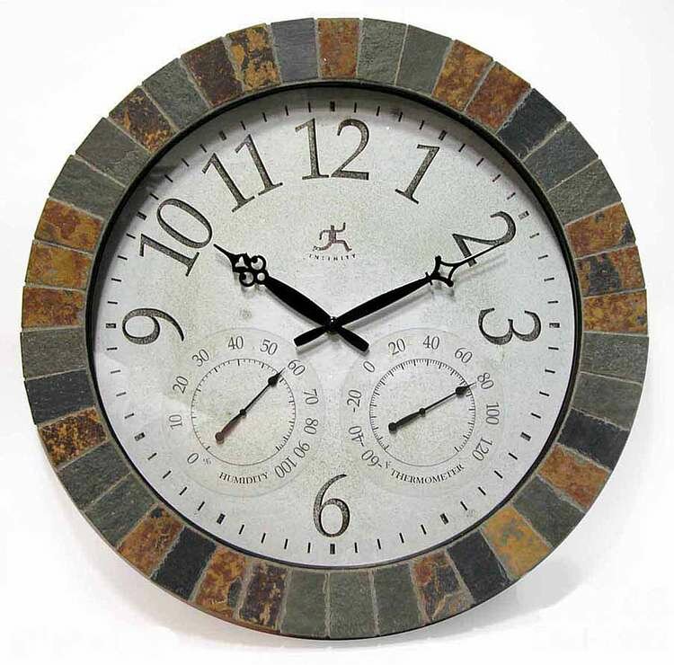 The Inca is an ideal indoor/outdoor wall clock with it's slate designed case this beautiful clock has the look and feel of the outdoors. With it's hygrometer and thermometer you'll be able to keep up-to-date with what is going on in your own back yard. 18" Round Diameter. Slate Mosaic Designed Case w/ Hygrometer & Thermometer.