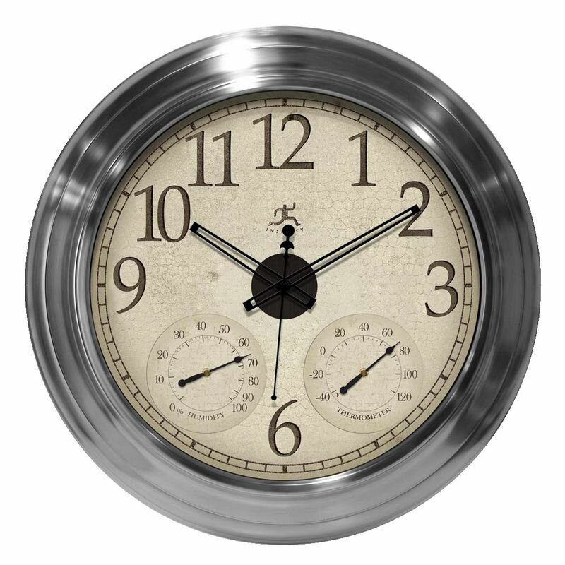 Introduce a new style to your home with this sophisticated sloar powered indoor/outdoor wall clock. The open-center hands, whisper quiet sweep second hand, and additional temperature and humidity gauges are a great combination for this clock. This is a perfect clock for the energy conscious individual. Brushed nickel finish.