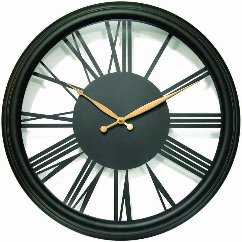 Black metal open dial clock protected by a glass lens. Contemporary styling. The hands are metal and finished in a gold color. Black Roman numerals at every hour. For in/outdoor use, protected against most climates.