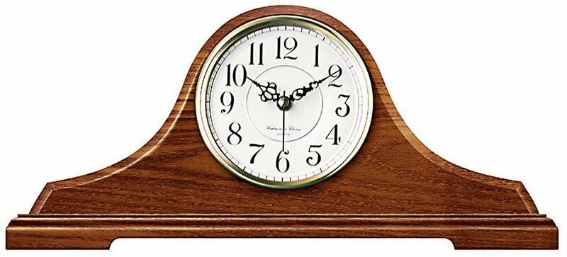 Traditional style oak tambour mantel clock. Features black decorative hands and Arabic numbers at every hour. Sounds West Minster chime every hour.