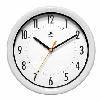 This wall clock has a white iron frame . White dial with Arabic numbers and hash marks at each hour and second. Black metal hour and minute hands with a red second hand. Operates on a highly accurate quartz movement and one "AA" battery, not included. Guaranteed by a three year manufacturer's warranty.