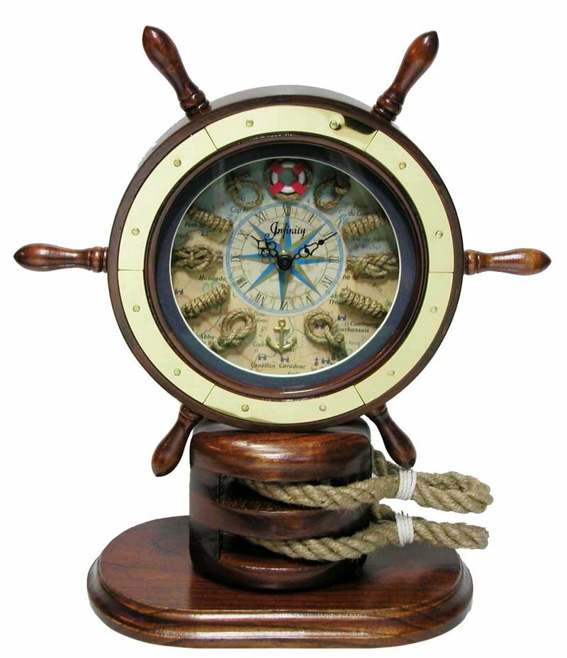 This table clock is one of a kind in a ships wheel design. The dial is a map pattern, with nautical knots at every hour and black metal hands.