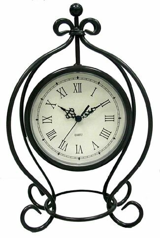 Black metal table clock. Antique style with a modern look. White dial featuring black roman numerals at every hour, black decorative hands including a second hand. Operated by a highly accurate quartz movement and one "AA" battery, not included. Guaranteed by a three year manufacturer's warranty.