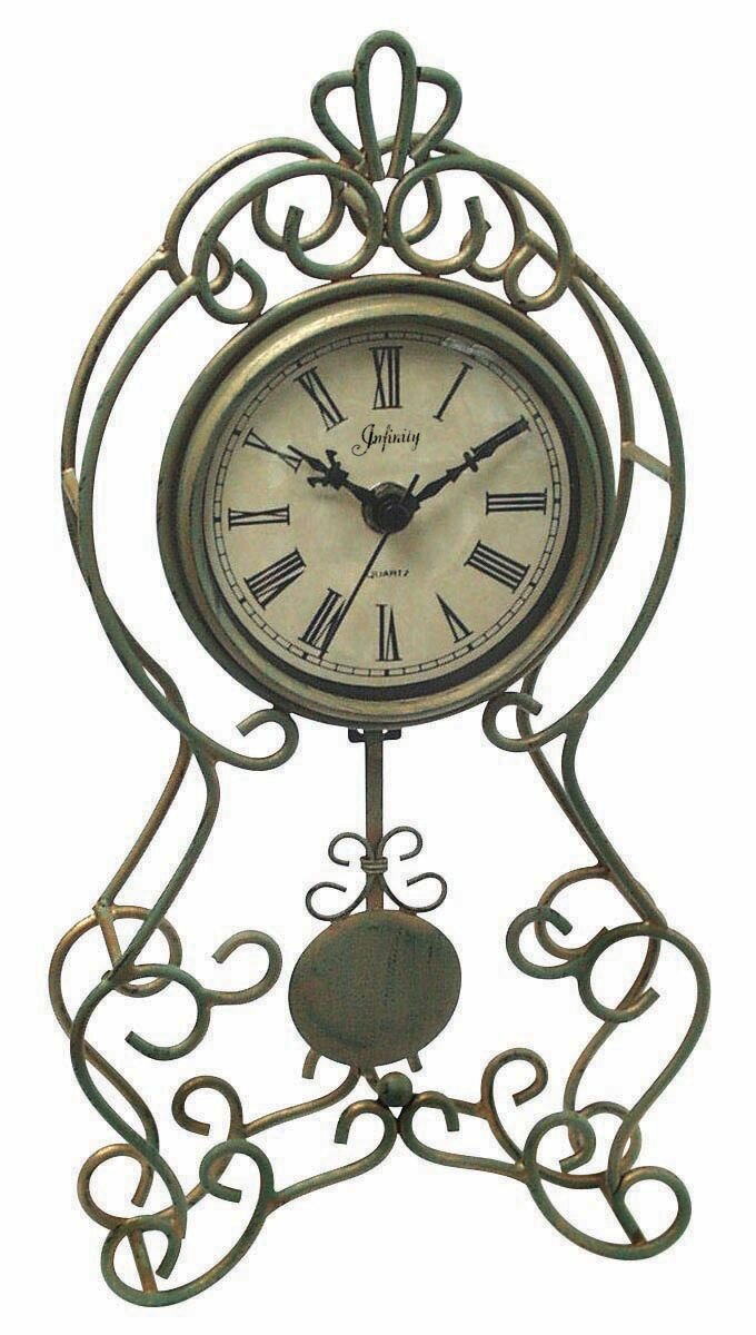 Green and gold wrought iron table clock with working pendulum. Off white dial with Roman numerals at every hour. Black metal hands.