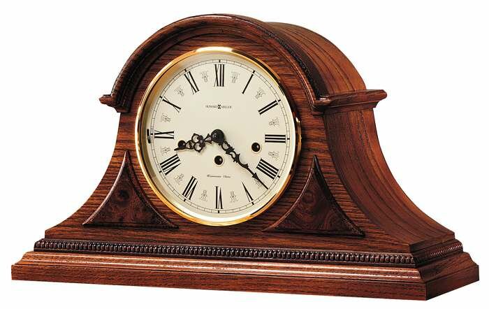 The Worthington Mantel Clock by Howard Miller is finished in Oak Yorkshire on select hardwoods and veneers.