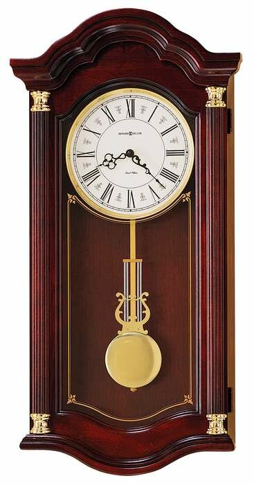 The Lambourn I Wall Clock by Howard Miller is finished in Windsor Cherry on select hardwoods and veneers and features a off-white Roman numeral dial and serpentine hands.