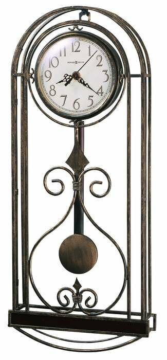 The Melinda Wall Clock by Howard Miller features an open metal case with a cherry finished wood panel base.