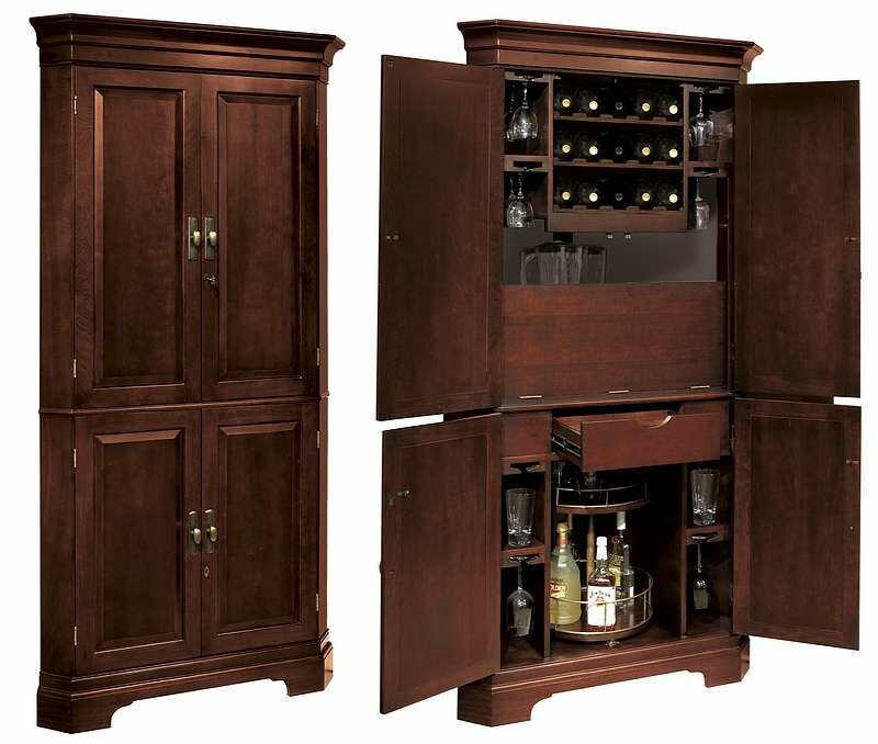 • This handsome corner, wine and bar cabinet features four raised panel doors with antique brass finished hardware