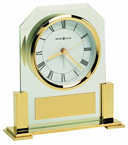The Paramount Table Clock by Howard Miller is a polished brass-finished clock with beveled glass and an alarm clock.