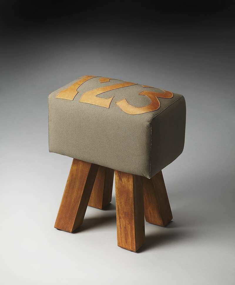 This stylishly designed, unconventional Ottoman is as simply compelling as 1, 2, 3. Four overscaled, blocky legs crafted from select solid wood in a warm brown finish support the overstuffed top with numbers stitched into durable, taupe-toned cotton fabric. Moderate Distressing. Made using Recycled wood solids, cotton-poly blend fabric, urethane foam. Comes Fully Assembled. Ships via UPS/FedEx.
