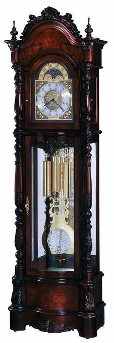 The Veronica Grandfather Clock by Howard Miller is finished in a satin Windsor Cherry on select hardwoods and veneers. Victorian style floor clock offers ornate pediment with book matched rare olive ash veneer, carved shell and leaf motif, and two turned urn finials. Polished-brass dial features cast corner spandrels, silver-colored chapter ring with brass Arabic numerals, and illuminated astrological blue moon dial. Crystal cut glass center disk on dial and polished-brass lyre pendulum. Mirrored back; illuminated case with two lamps; frosted glass in base. Bottom door glass is serpentine-shaped; beveled glass on sides; and plain glass on upper door. Decorative shell and leaf overlay on door.