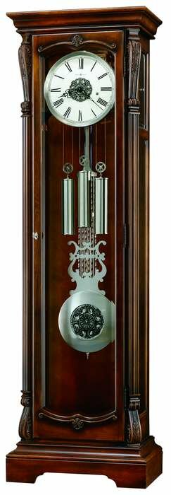 The Wellington Floor Clock by Howard Miller is finished in Hampton Cherry with distressing on select hardwoods and veneers. Flat-top pediment with distinctive columns and carved caps. Door features decorative overlays. Soft-ivory dial with brushed-nickel bezel, black Roman numerals, and antique nickel-finished decorative center disk. Brushed nickel-finished weight shells and lyre pendulum with decorative center disk. Illuminated dial. Beveled glass throughout.