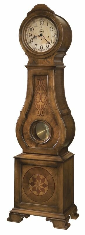 The Cambridge Floor Clock by Howard Miller is finished in Autumn Cherry with heavy distressing on select hardwoods and veneers. Hinged top door with a decorative ring which frames the convex glass and a removable crown made from V-matched Movingue veneers. Bottom door offers an inset panel with a decorative ring which frames the convex glass to reveal the pendulum. Inlaid marquetry on the inset panel. Base has an inset panel of reverse diamond matched Movingue veneers and a complementing inlay.