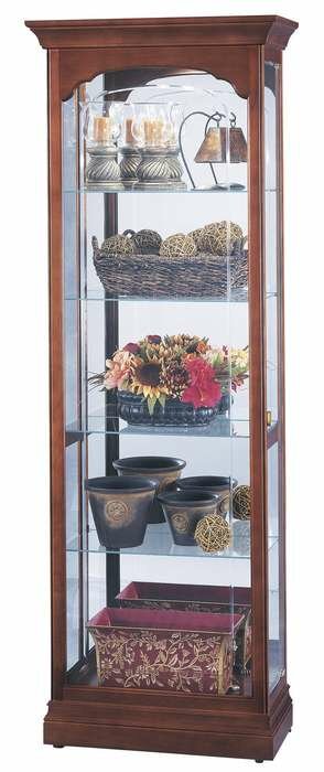 The Portland Display Cabinet by Howard Miller is finished in Windsor Cherry on select hardwoods and veneers and offers a flat top pediment and delicately scalloped front. Full-length crystal-cut grooved glass on the front. Four adjustable glass shelves with continuous holes for shelf adjustment.