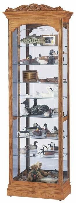 The Cumberland Display Cabinet by Howard Miller is finished in Golden Oak on select hardwoods and veneers and features decorative shell and leaf overlays on a removable top crown, plus eight levels of display. Full-length crystal-cut grooved glass on the front. Seven adjustable glass shelves with continuous holes for maximum shelf adjustment.