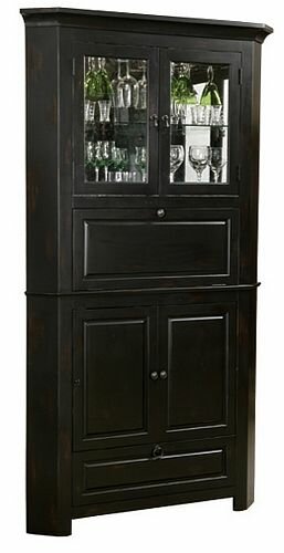 The Cornerstone Estates Wine & Bar Cabinet by Howard Miller is finished in a Worn Black with brown undertones on select hardwoods and veneers and features ample storage with a space-saving corner design. Upper compartment features heavily seeded glass panes in the front doors and contains an adjustable glass shelf. Middle compartment also provides storage and features a drop-down prep shelf for mixing and serving. A fixed shelf with glass insert allows light into the middle compartment. Revolving door with two fixed shelves provides additional storage. Lower two-tiered nested wine storage drawer holds up to 10 bottles. Hanging stemware rack keeps stemware handy. (Wall Dimension: 32").