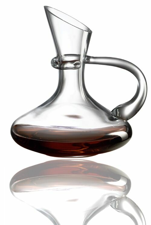 Like all ship decanters, the Handled Captains Decanter has a broad base, originally used to prevent tipping on the rolling waves. This base enhances the notes of your favorite wine! A handle swoops around the neck.  Height: 10 in X  Capacity: 57 oz