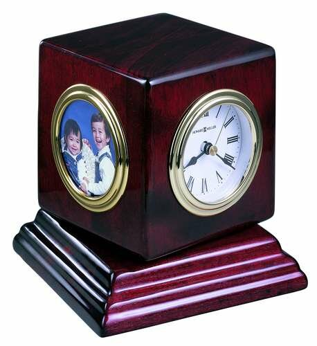 The Reuben Table Clock by Howard Miller is a high-gloss, Rosewood Hall-finished cube that easily turns on a high-gloss stepped base. The clock, hygrometer, and thermometer feature white dials, black numerals, water-fall style brass-tone bezels, and photo frame on fourth side.