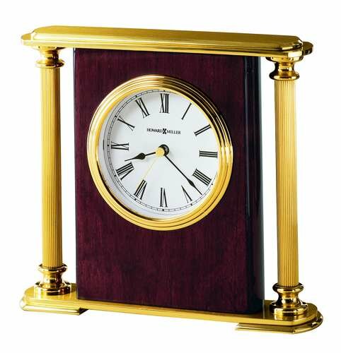 The Rosewood Encore Bracket Table Clock by Howard Miller has fluted brass columns and a solid brass top and base frame. The center panel has a high-gloss, Rosewood Hall finish on select hardwoods.