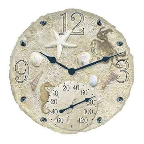 StoneWorks 12" Indoor/Outdoor Seashell Clock with Thermometer - 91672-1. Outstanding poly-stone material. Perfect for pool or patio.