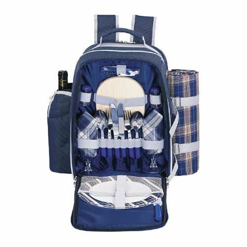 This traditional style backpack by Sutherland is transformed into the ideal wine and cheese picnic pack. It features a zip pocket on the side to hold wine or other bottled beverage and the other side has straps to hold the 45'' x 52'' roll up polyester blanket with waterproof PVC backing. The front has an additional zip compartment for extra storage. It has a convenient carrying handle on top as well as padded shoulder straps for comfort. Service for 2.