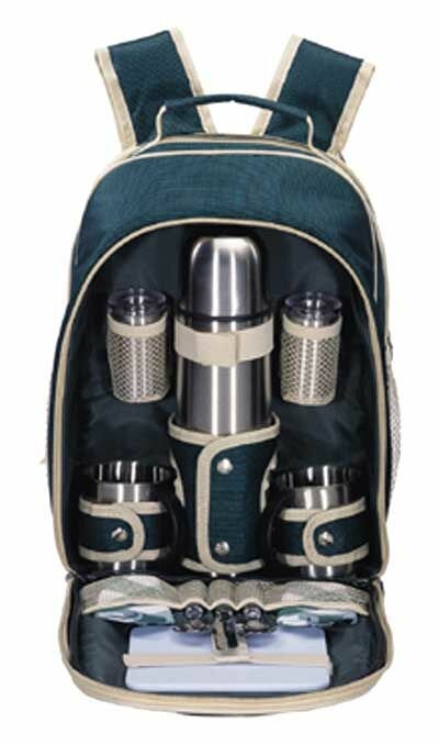 This backpack style bag by Sutherland has everything you need for a coffee and cheese picnic for 2. It features mesh side pockets and shoulder straps that are adjustable and padded for comfort. Great gift idea for the coffee connoisseur!