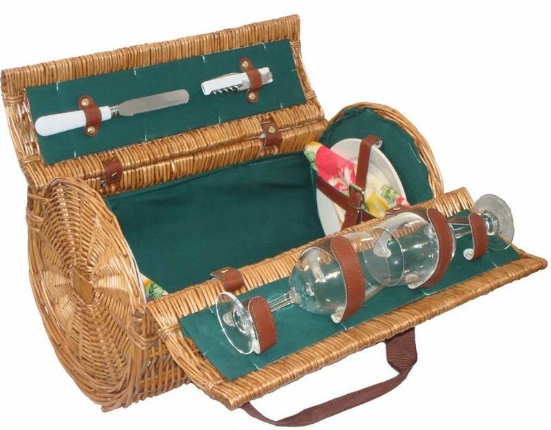 This uniquely designed, double-lid, handcrafted Sutherland basket serves a party of 2! Made from willow and fully lined with hunter green fabric with your choice of matching napkins. It is accented with decorative straps, hinges and closure with gold tone clasp. The double sided lid opens for easy access. It has a sturdy stationary handle for carrying. Ideal for any gift giving occasion!