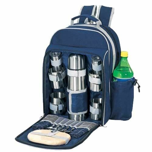 This backpack style bag by Sutherland is a coffee lovers delight! It features an adjustable bottle holder on one side and mesh pocket on the other. The shoulder straps are adjustable and padded for comfort. Service for 4.