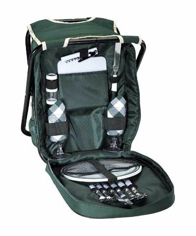 This innovative 3-in-1 coffee and cheese backpack from Sutherland features mesh side pockets and padded shoulder straps for comfort. It also has insulated cooler compartment to keep your food items cold while providing a place to sit too. Includes everything you need for a leisurely outdoor picnic or tailgate party. Service for 2.