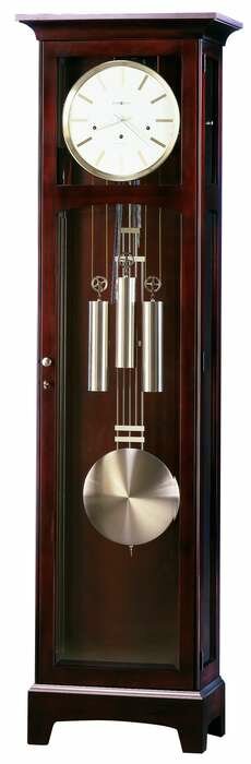 This Howard Miller floor clock is finished in Black Coffee on select hardwoods and veneers and features a flat-top pediment with nickel-finished moldings, doorknob, weights, and pendulum.